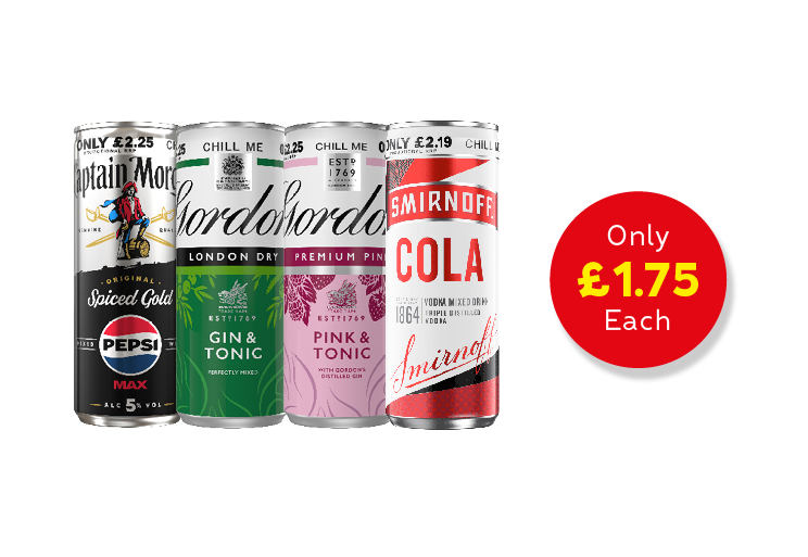 Capt Morgan • Gordon’s • Smirnoff Cans, 250ml, V.A.S, PM £2.19/£2.25