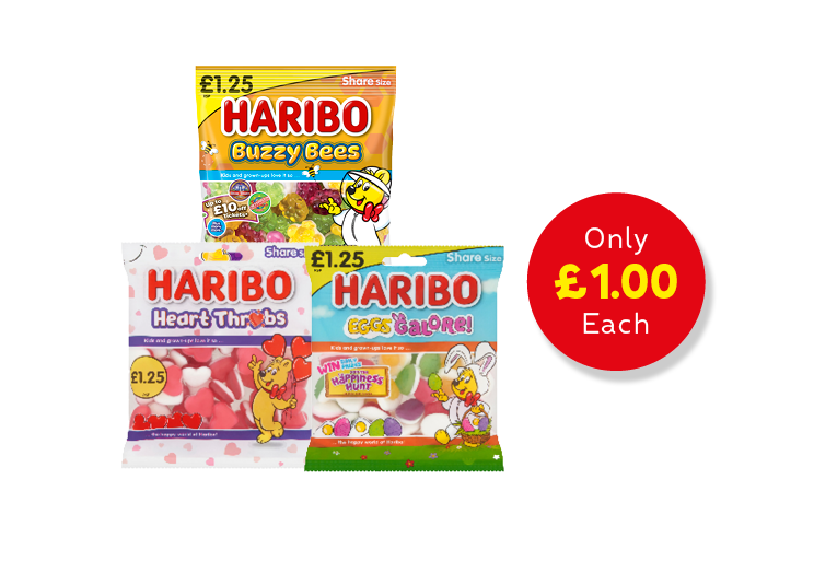 Haribo Bags, 140g, Heart Throbs / Eggs Galore / Buzzy Bees, PM £1.25